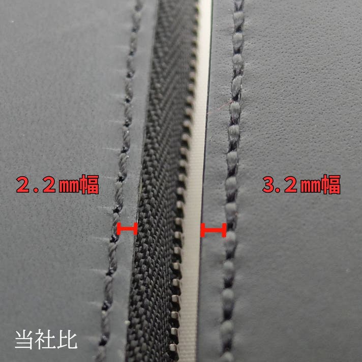 また、縫い幅にもこだわりが。通常は3.2㎜ほどで縫うのですがファスナー幅を多く取るために2.2㎜幅で縫っております。