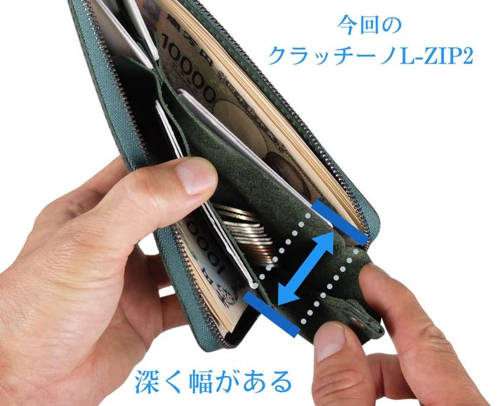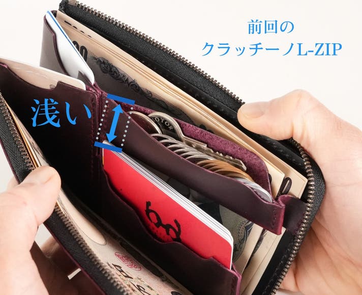 - シンプルなデザインは継承しつつ、引っ張り出す小銭入れを追加したクラッチーノL-ZIPの第2弾