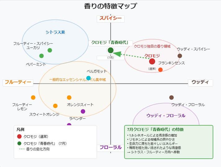 小国町の夏クロモジは、一般的なクロモジの特長(ウッディ・スパイシー領域)から特徴が変化します。