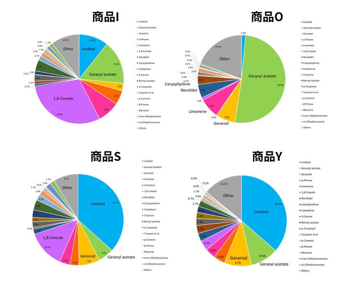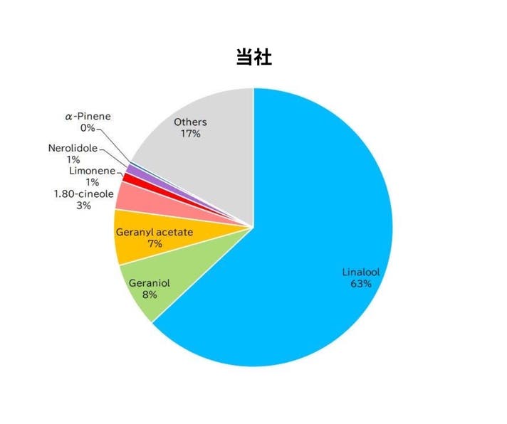 当社の製品では、リナロールが約63%となっており、極めて大きな特徴となっています。