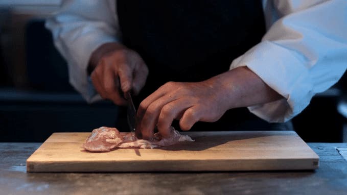 菜切り包丁は、野菜を切るためにつくられてはいますが、もちろんお肉もきれいに切ることができます。切りづらい生の鶏肉の皮もスムーズにカットできます。