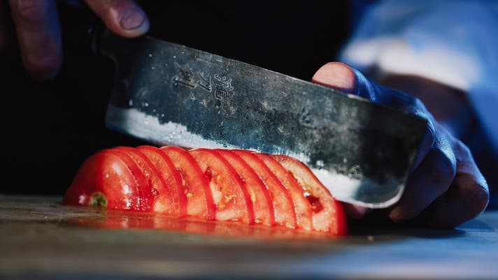完熟トマトもやさしくスッと切れる、驚きの切れ味。料理人も認める確かな切れ味と、黒光りする美しいシルエット。