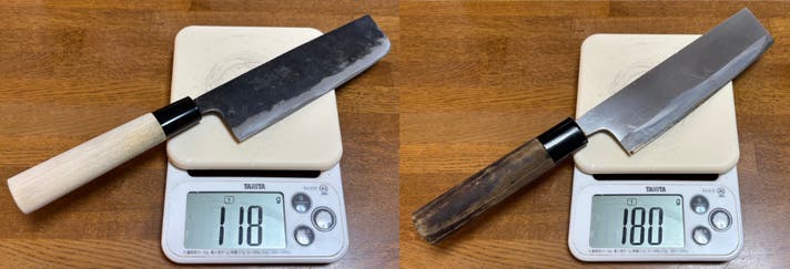 自社従来品の菜切り包丁の重さが約180gなのに対し、瀧刀剣の黒打菜切り包丁はたったの118g!軽いので、毎日使う包丁としておすすめです。