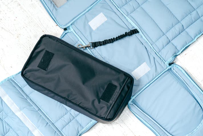 大雨の避難時だけでなく、雨の日の通院にもお使いいただけるレインカバー付きです。サッと被せられて、空気穴もある専用袋入りの特別仕様。キャリーを覆うことで周りの環境に敏感なペットも落ち着いて過ごせます。