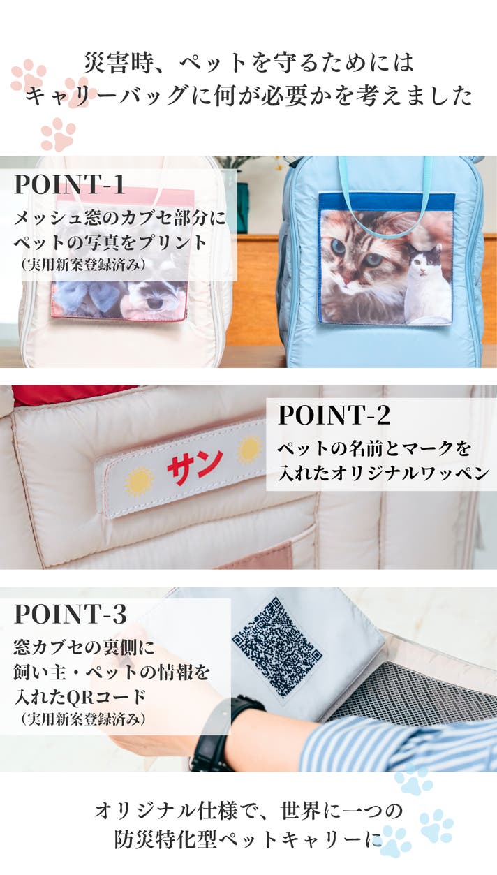 - ペットの顔写真プリント+情報入りQRコード+名札=世界に一つの防災キャリー !