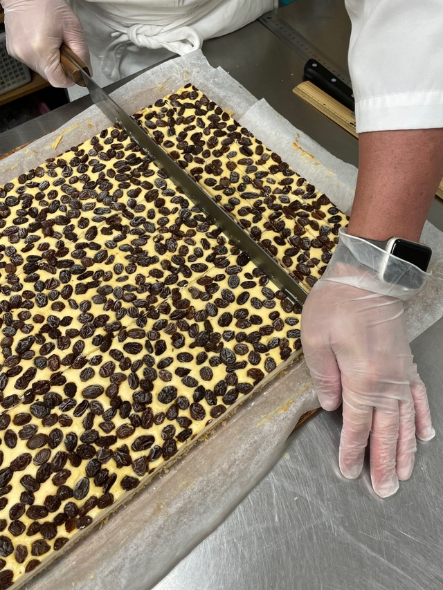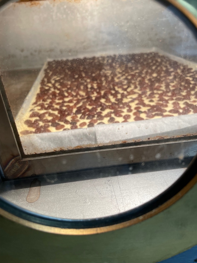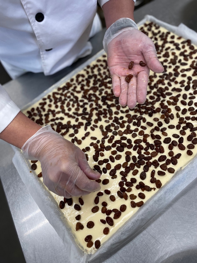 ラム酒漬けしたレーズンを敷き詰めていきます。