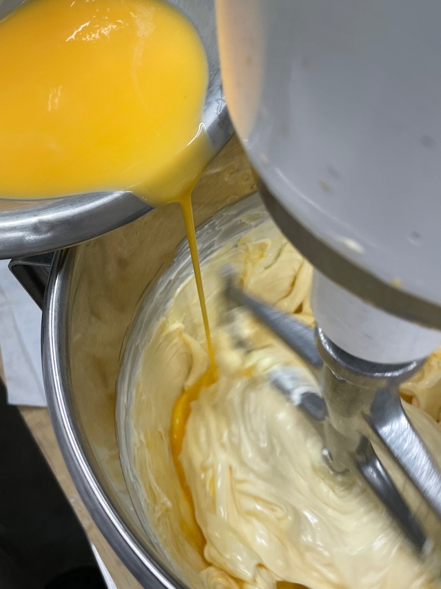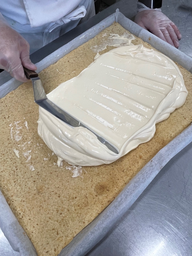焼きあがった土台部分の上に攪拌したクリームチーズ等を流し込み、形を整えます。