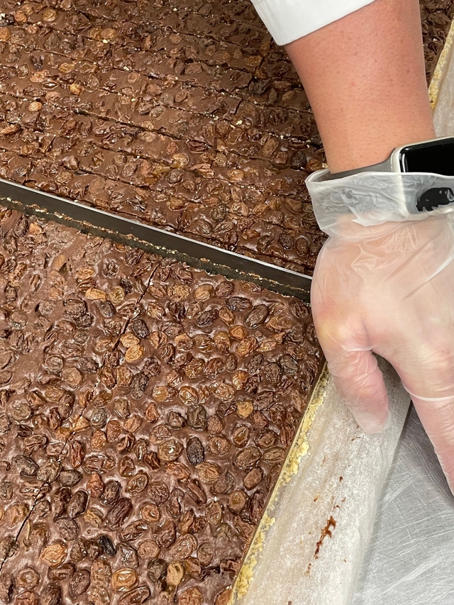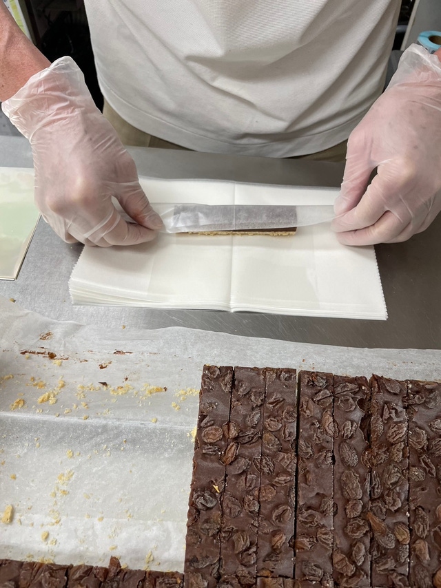 出来上がった生チョコレートは急速冷凍機で冷凍後カットしていきます。