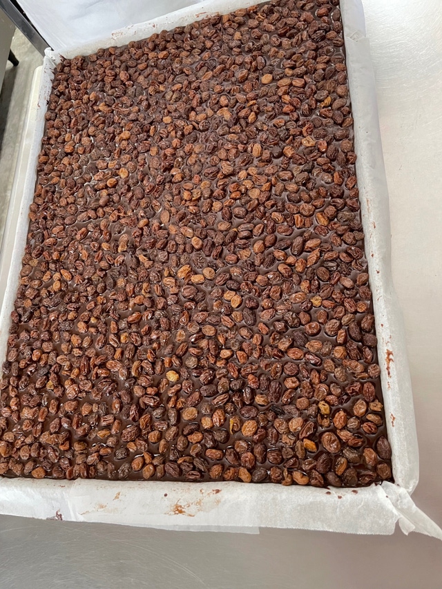 ラムッチョは湯煎した生チョコの材料にラム酒を混ぜ合わせ成形し、その上部にラム酒漬けしたレーズンをトッピングしてあります。濃厚なチョコとレーズンの甘みが相まって、さらに生チョコのうまさを引き出しています。