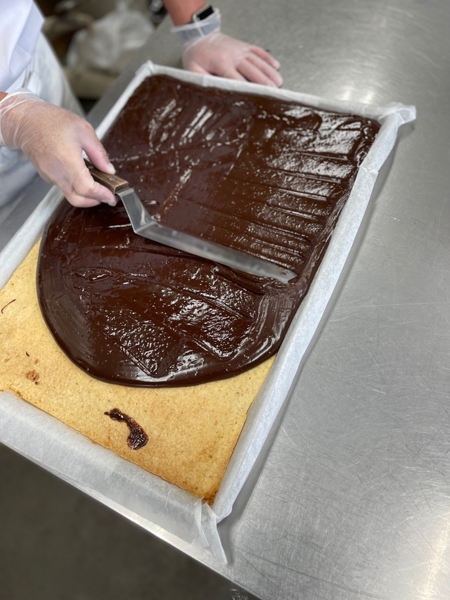 焼きあがった土台部分の上に攪拌した生チョコレートを流し込み、形を整えます。