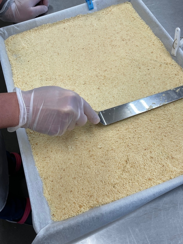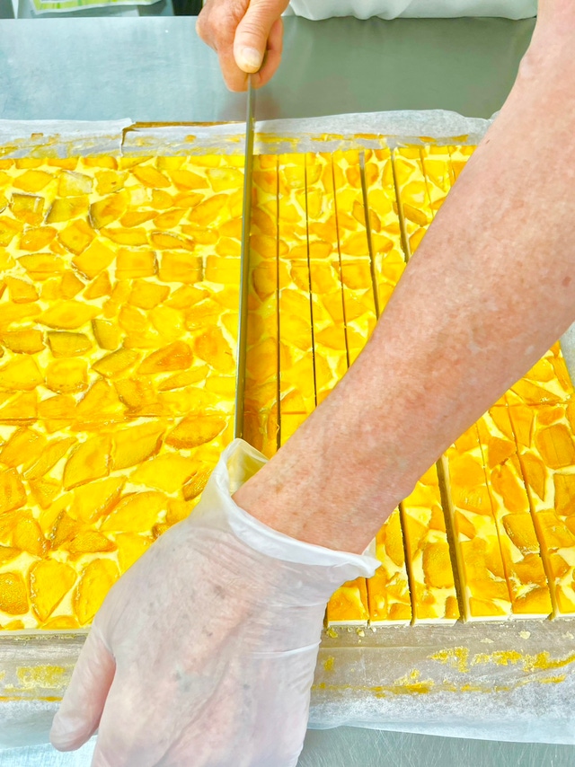 焼きあがったマンゴーの愛を急速冷凍機により一気に冷凍し、カットしていきます。
