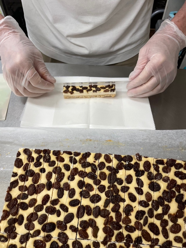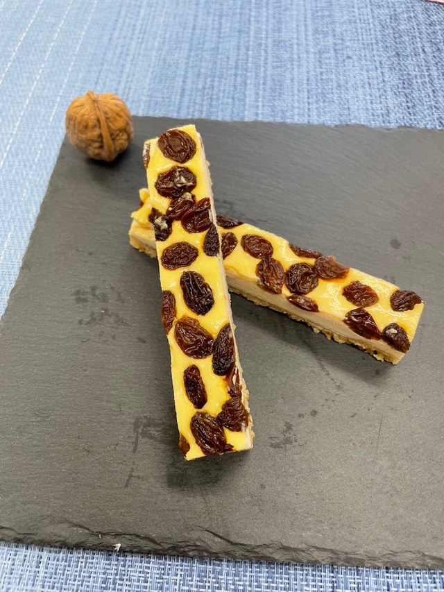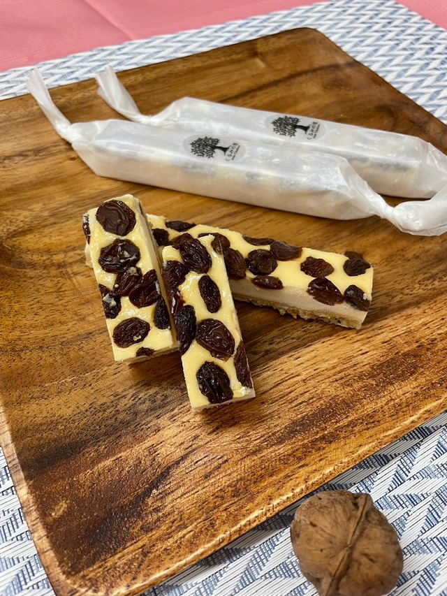 ラムッチーはチーズケーキの生地ににラム酒を混ぜ合わせ成形し、その上部にラム酒漬けしたレーズンをトッピングし、窯で焼き上げています。ラム酒漬けしたレーズンがチーズケーキのコクを増して味を引き立てています。