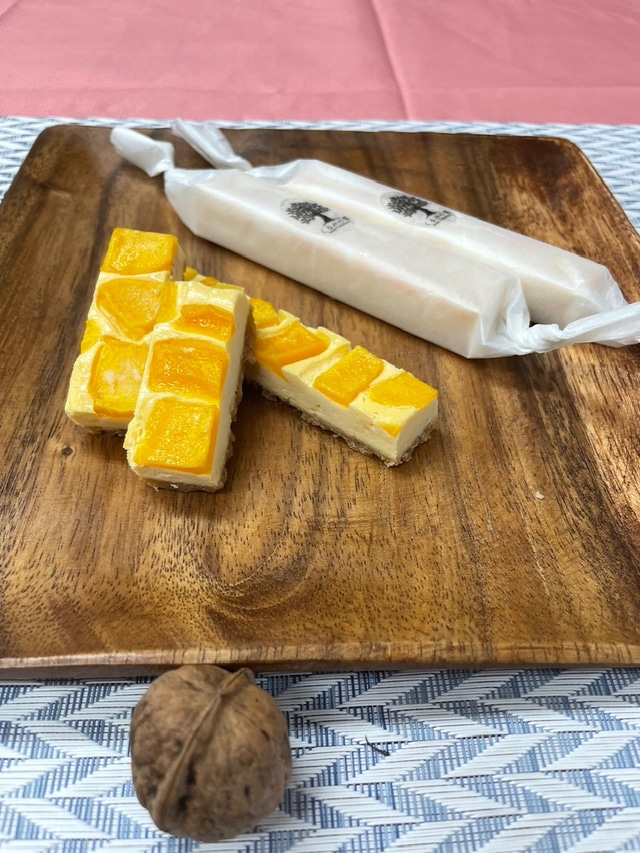 原材料:クリームチーズ(フランス産)、マンゴー、生クリーム、砂糖、サワークリーム、卵、小麦粉、バター、コーンスターチ、アーモンドパウダー(一部に小麦、卵、乳成分、アーモンドを含む)