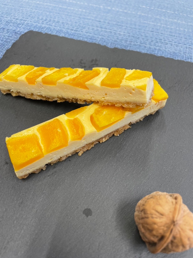 マンゴーの愛はチーズケーキの生地にマンゴー果汁を混ぜ合わせ成形し、その上部にマンゴーをトッピングし、窯で焼き上げています。マンゴーとチーズのハーモニーがお口いっぱいに広がり至福のひとときを楽しめます。