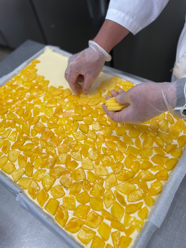 カットしたマンゴーの果肉を敷き詰めていきます。