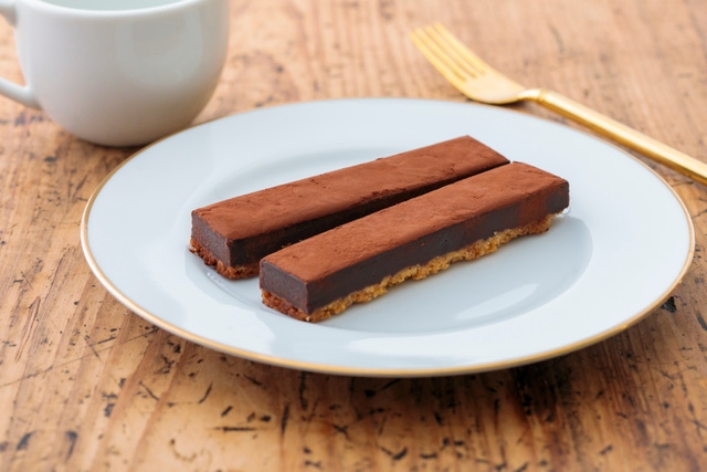 アーモンドのさくさくのクッキー生地と口の中でとろける濃厚なチョコレートが2層になったスティック状のケーキです。クッキー生地の秘密はアーモンドをたっぷり使い、国産の小麦粉、バターを使った生地を2度焼きしているからです。