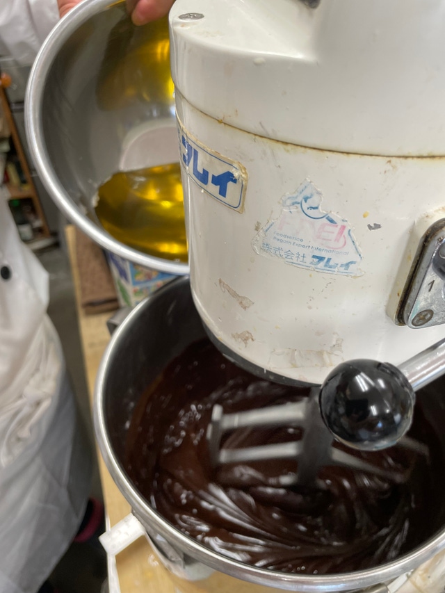 湯煎したチョコレートと溶かしたバター・ラム酒・生クリーム・牛乳等を攪拌します。