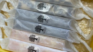 焼きあがったラムッチーを急速冷凍機により一気に冷凍し、カットしていきます。