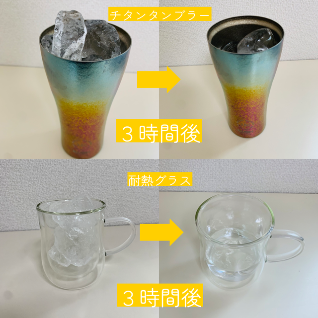 チタンタンブラーは、こんなに氷が残っています。タンブラーも濡れていません。