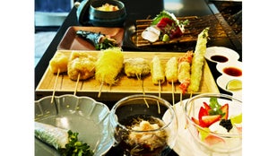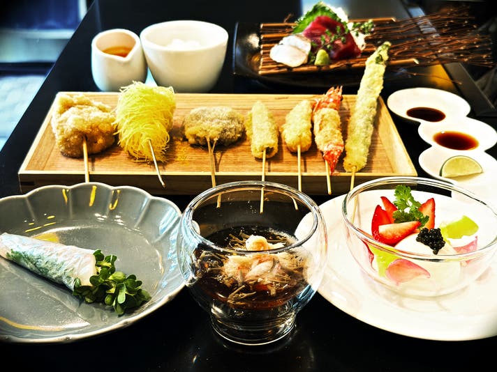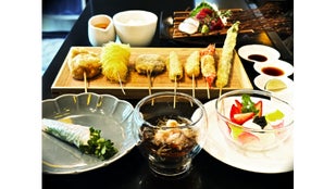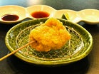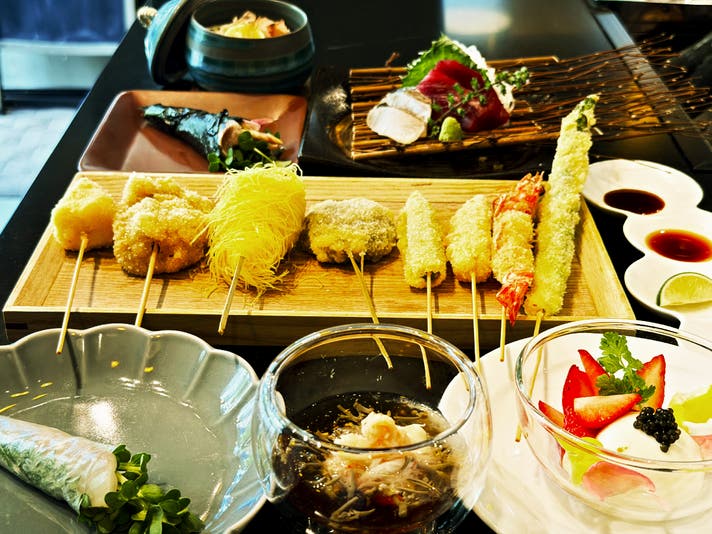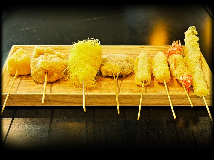 - 一頭買いの山形牛、豊洲直送の魚介類や季節の食材を、独創的な「進化系串揚げ」で堪能する。