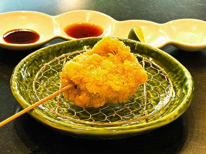 また、串揚げの最大の魅力は、その「自由度」にあります。 たとえば、「山形牛すね肉の赤ワイン煮込みカツ」や「帆立のカダイフ巻き レア揚げ 」。これまでの焼肉店や寿司店という枠組みでは表現しきれなかったクリエイティブな組み合わせを、一串一串に凝縮してご提供できる。