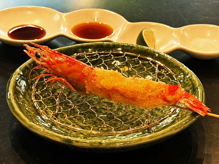 鮮度抜群の車海老を豪快に。殻の香ばしさと、中心部のぷりっとした甘みのコントラスト。素材の良さをストレートに感じる一串です。