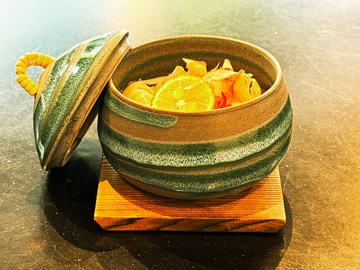 透き通る出汁と、つるりとした喉越しの稲庭うどん。すだちの香りで最後の一口まで清々しく、コースを美しく締めくくります。