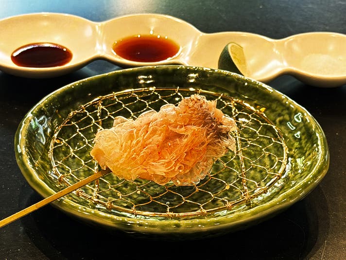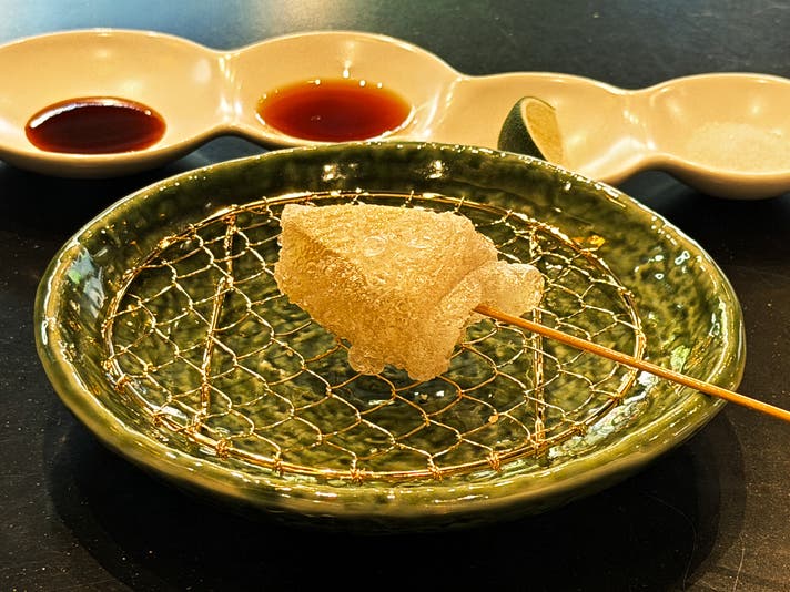 蟹の繊細な身と、じゅんさいの涼やかな食感を土佐酢で。お口の中を清涼感で満たし、次の一串への期待を高める名脇役です。