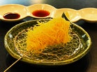 極細のパスタにキャビアの塩気を纏わせた、贅を尽くした冷菜。シャンパーニュとのマリアージュを楽しんでいただきたい、華やかな一皿です。