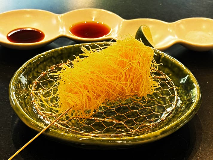 極細の麺状素材 “カダイフ” を巻き付けて揚げることで、一般的な串揚げを超えるザクザク感を演出しました。帆立のレアな食感とのマッチングが最高です。