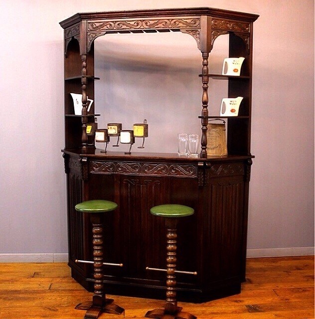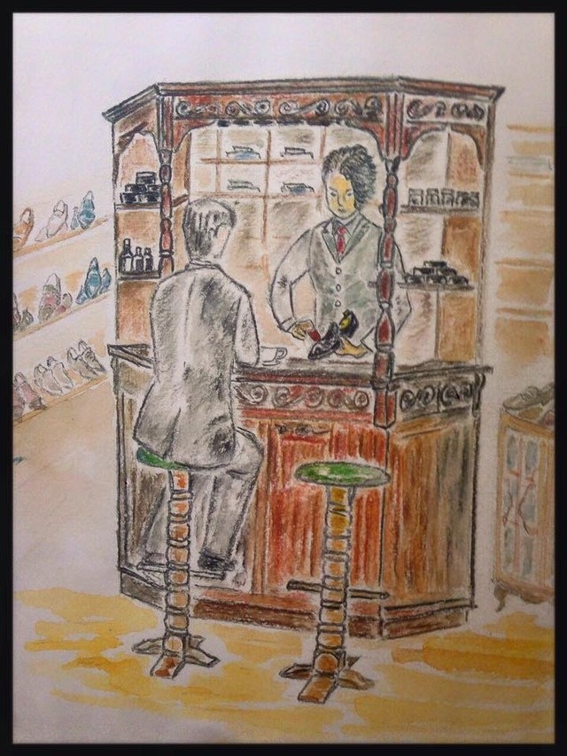 イラストのような英国パブカウンターで、会話をしながら靴を磨きあげる