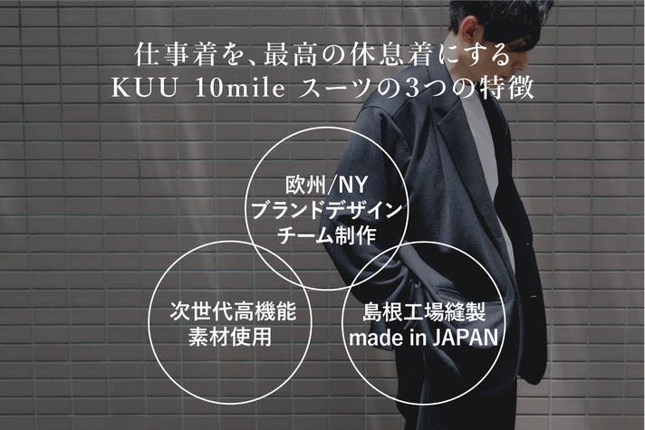 KUU 10mile CONDITIONING SUIT は、欧州/NYで実績を重ねたディレクションと日本の縫製精度から生まれた、“見せられるコンフォートウェア”。