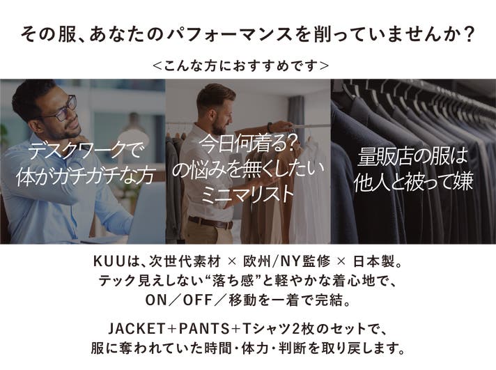 KUU アクティブセットアップは、スウェットのように心地よく、ジャケットのように“ちゃんと見える”。軽くてやわらかいのに、動くほどドレープが映えて、所作まで美しく。一日中、着替えずに仕事も私生活も“整う”ための一着です。