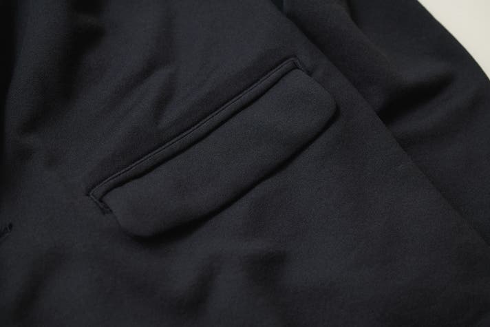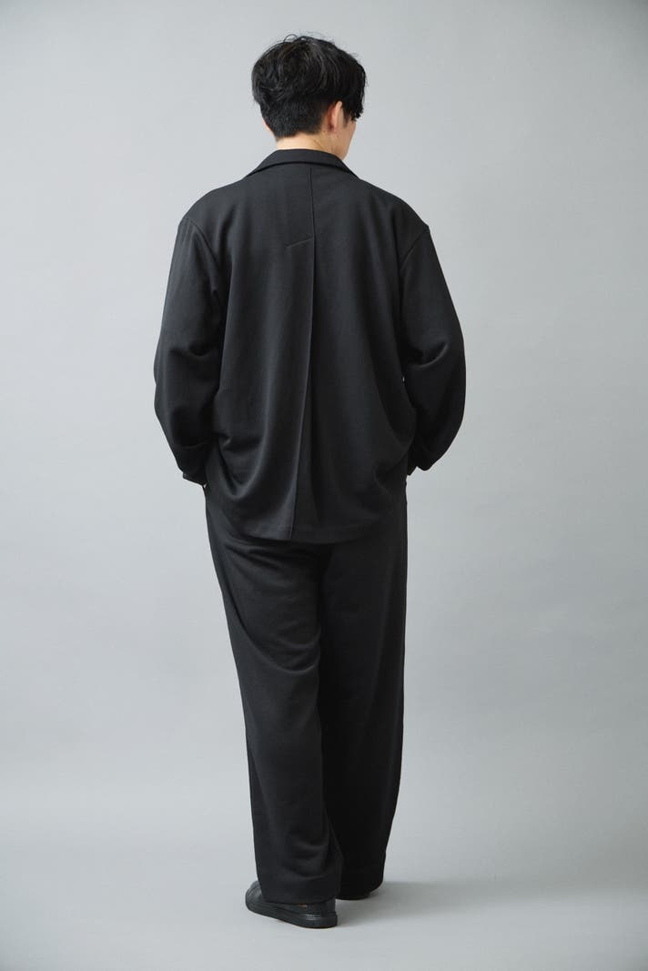 ジャケットの前面にはラペル横に細やかなプリーツを配置。胸板の厚みに左右されず、立体感とすっきりした印象を両立します。