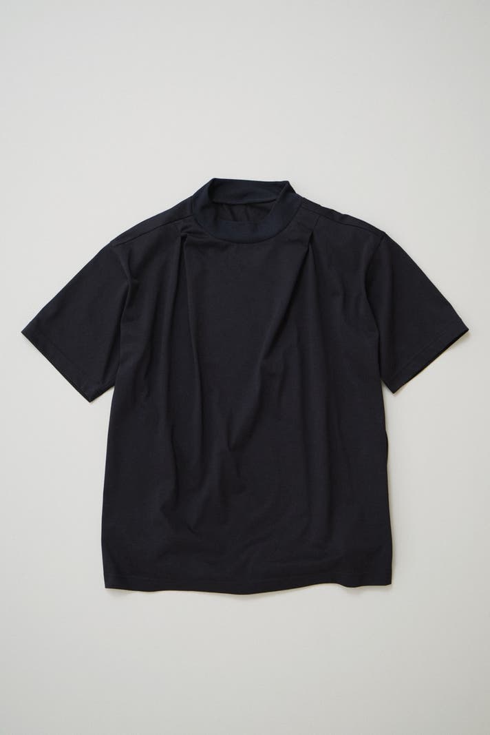 艶のある生地とモックネックが、画面越しでもきちんとした印象を演出。背中や胸元のタックが、長時間の着座でも自然な呼吸と余裕のある着心地を支え、立ち上がって移動するたびに、ドレープが所作を美しくつないでくれる。