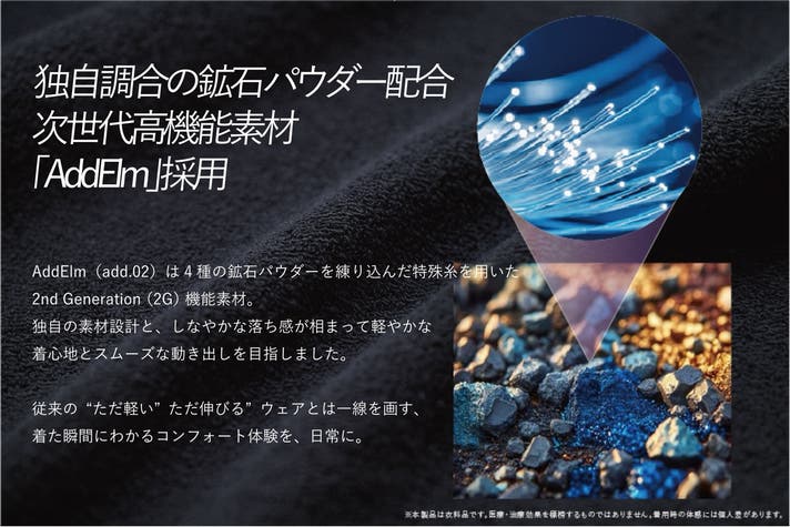 - 【次世代高機能素材】「AddElm」採用。着用時の快適性やパフォーマンスをサポート