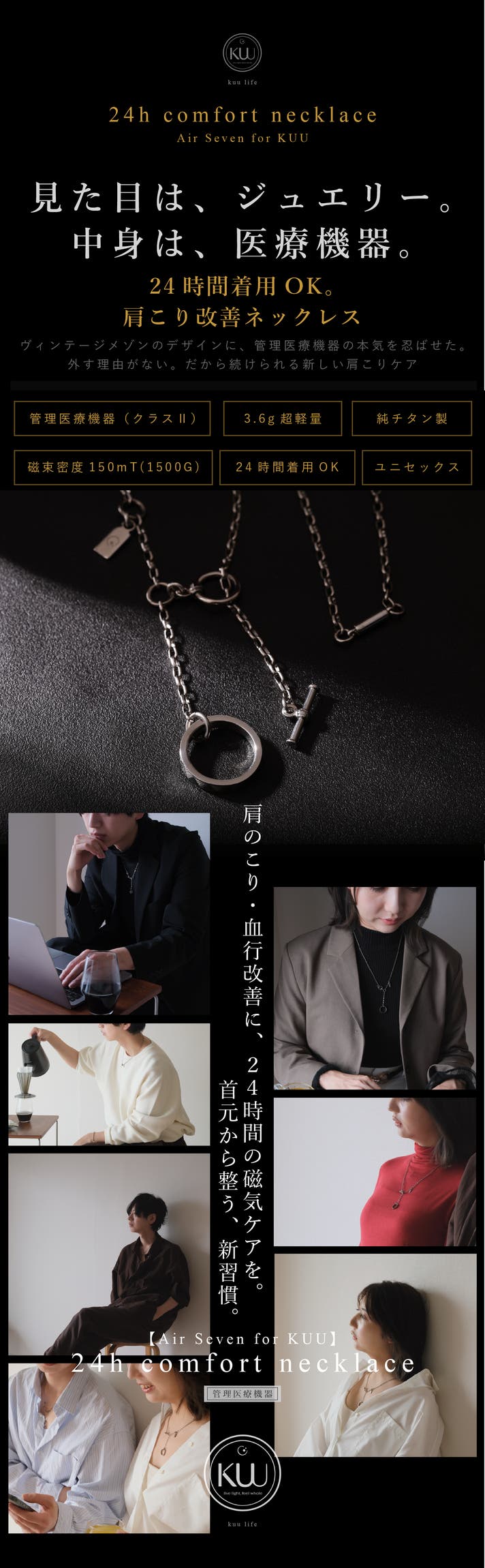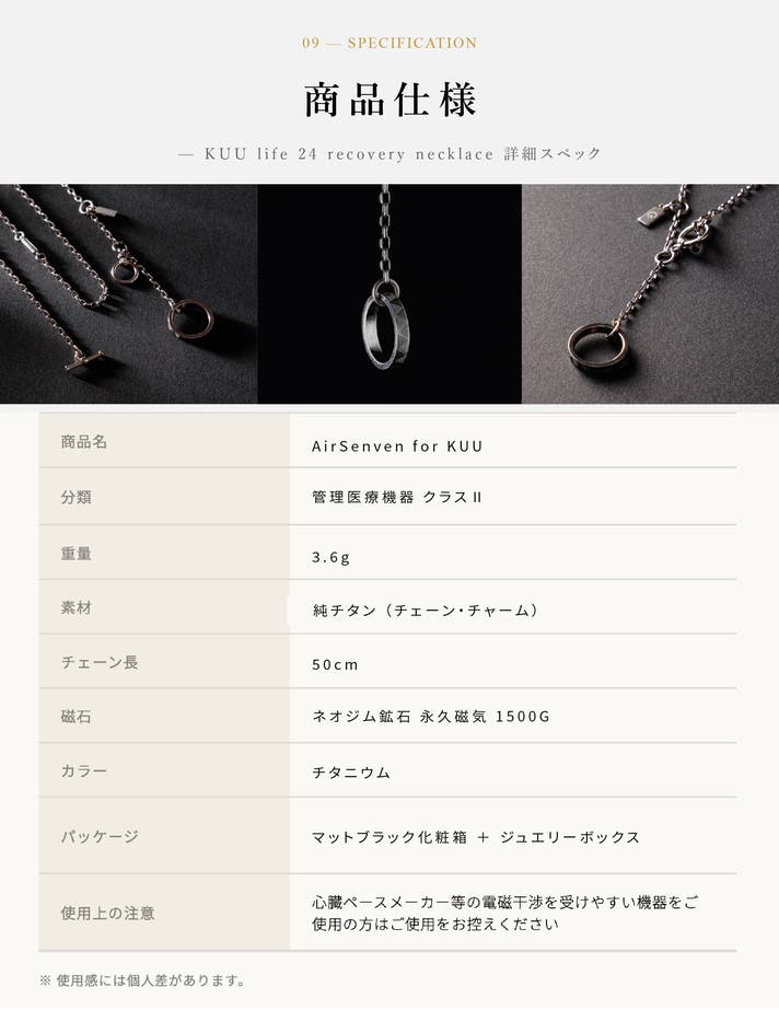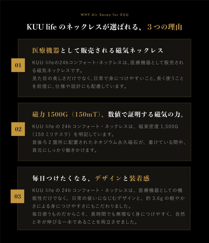 Air Seven for KUU(24hコンフォート・ネックレス)は、クラスⅡの管理医療機器として、装着部位のコリおよび血行の改善を目的としています。