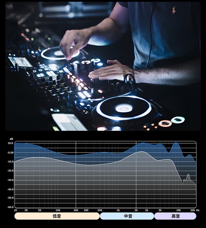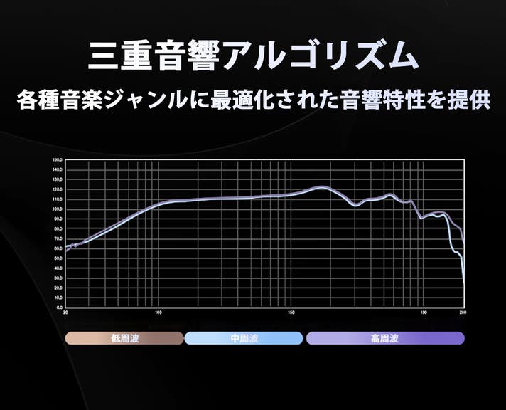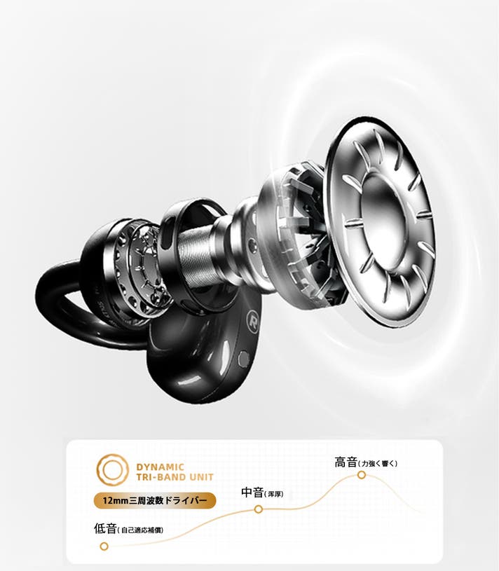 イヤーカフ型イヤホン特有の「音が逃げやすい」弱点を補完し、ベースやキックなどの低域成分をインテリジェントに検出。