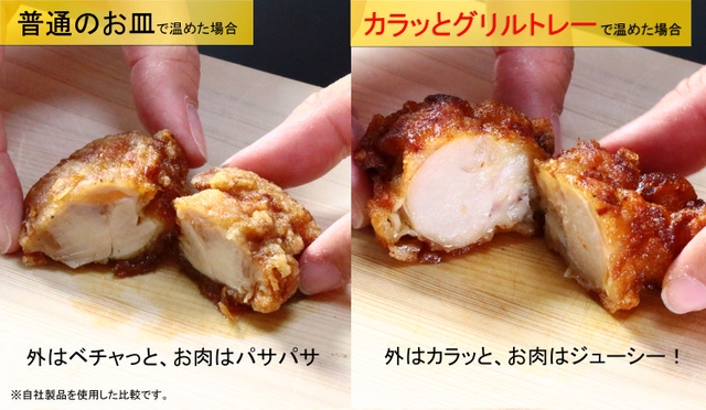 実際にスーパーで買ったお惣菜の唐揚げを、普通のお皿とグリルトレーで温めて断面図を比較してみるとこんなに違いがあります。