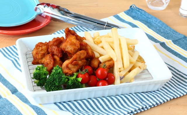油切り用のバットを使わずに、直接お皿に盛り付け!そのまま食卓に出せるので油を切りながら揚げたてアツアツが味わえる!