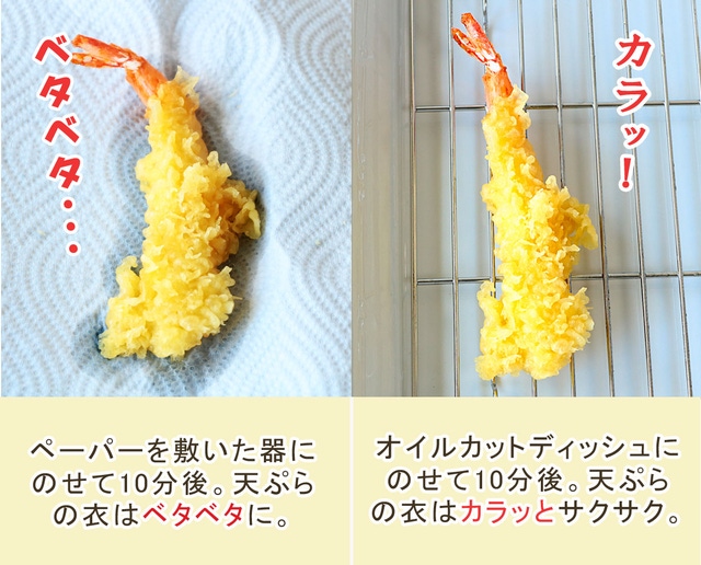 天ぷらも、キッチンペーパーの上にのせておくと油がしみ込んでベタベタになりやすですが、オイルカットディッシュにのせればいつでもカラッと揚げたての食感をキープ!