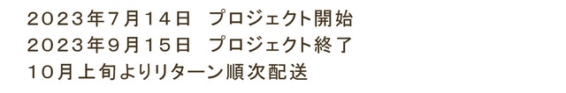 本文中に記載させていただいたスケジュールは、あくまでプロジェクト公開時点の予定です。 応援購入の性質上、配送遅延のおそれがございます。 原則として、配送遅延に伴う応援購入のキャンセルはできませんが、 リターン配送予定月から 3ヶ月 を超えた場合には、希望者に限りキャンセルにて対応させていただきます。