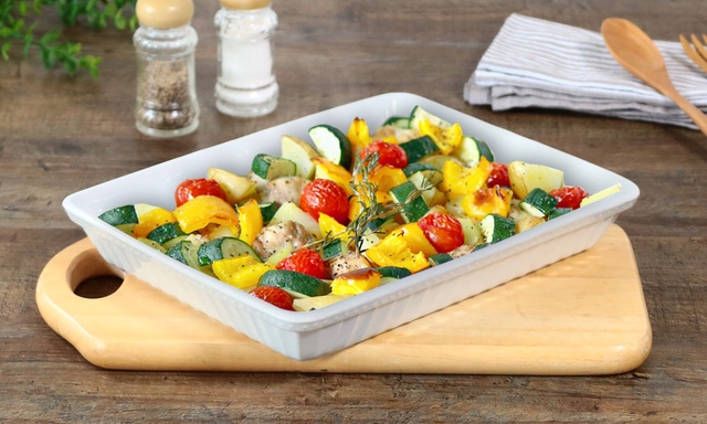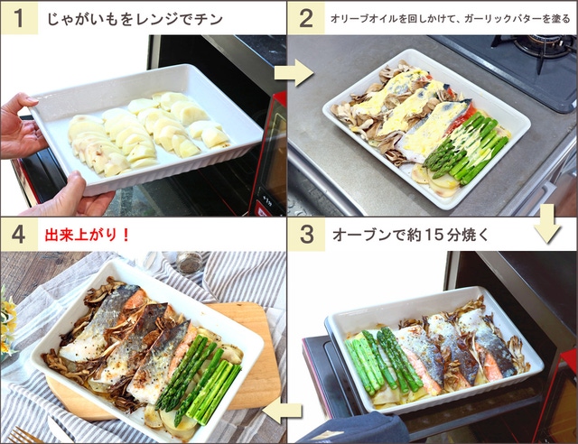じゃがいもなどの根菜類はレンジでチンして下ごしらえ。メインの魚や鶏肉と他の野菜を加えて調味料をひと振り。あとはオーブンで焼けば完成!
