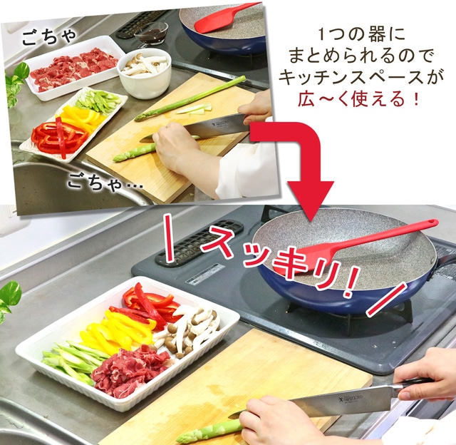 野菜をたくさん使った炒め物も、切り分けた食材でごちゃごちゃしてしまうけど…この器を使えばキッチンスペースもスッキリ!洗い物も減るので後片付けも楽々です。