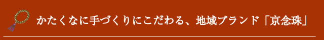念珠の生産量が全国で9割を占める京都は、創業300年、400年という老舗店もある念珠づくりの本場です。西陣を中心に、数珠を通す絹糸を入手しやすいという環境条件も活かしながら、受け継がれてきた伝統工芸品「京念珠」は、京都の街の特色を示す地域ブランド。