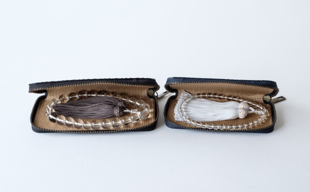 「お守り」として念珠を常に携帯することを想定しているので、念珠を入れるラウンドタイプのレザーケースを専用に開発しました。念珠は布袋に入れて持ち歩くのが一般的ですが、他のものとの接触による損傷や破損が気になるところ。その点、ラウンドタイプのレザーケースに守られていれば、心配は無用です。