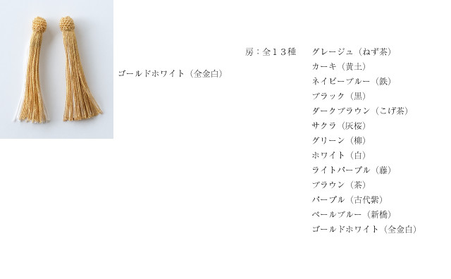 房:グレージュ(ねず茶)、カーキ(黄土)、ネイビーブルー(鉄)、ブラック(黒)、ダークブラウン(こげ茶)、サクラ(灰桜)、グリーン(柳)、ホワイト(白)、ライトパープル(藤)、ブラウン(茶)、パープル(古代紫)、ペールブルー(新橋)、ゴールドホワイト(全金白)