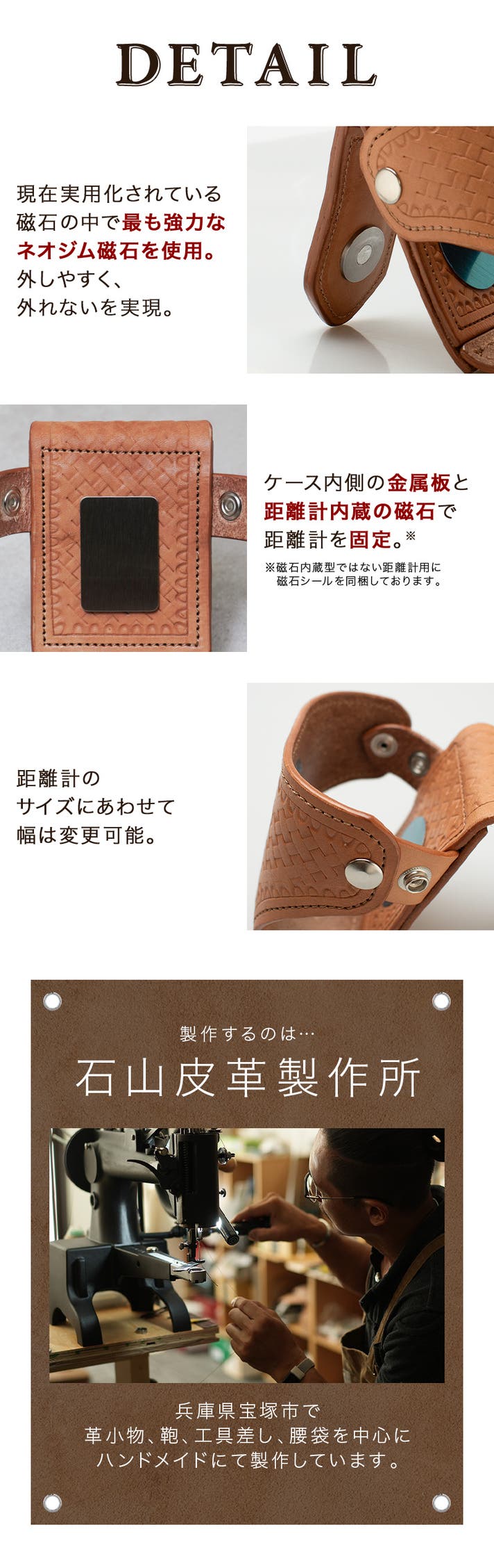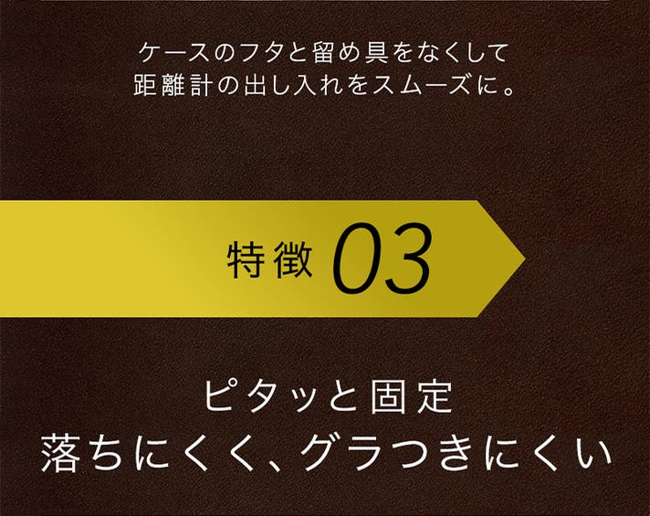 - 距離計の出入れ超簡単。腰ベルトへ装着も楽々(特許)。蓋なしで落ちにくく、揺れにくい(実用新案)