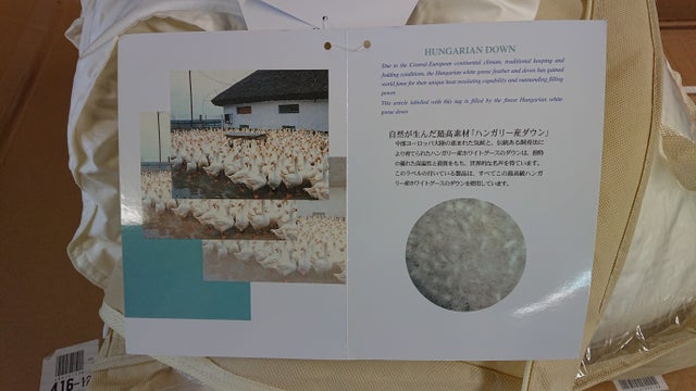 中の羽毛はハンガリー産ホワイトグースダウン93%を使用しています。