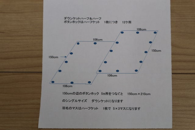 ・また、羽毛肌ふとんシングルサイズとしてご使用される場合、ハーフケットの150cm幅の方を5ケ所のボタンホックで繋いで頂くのですが、ホックの間が少し空きます。そのまま使うと足などを引っかけ転倒される恐れがありますので、必ず150/210㎝のシングルサイズ掛けカバーを掛けてご使用してください。